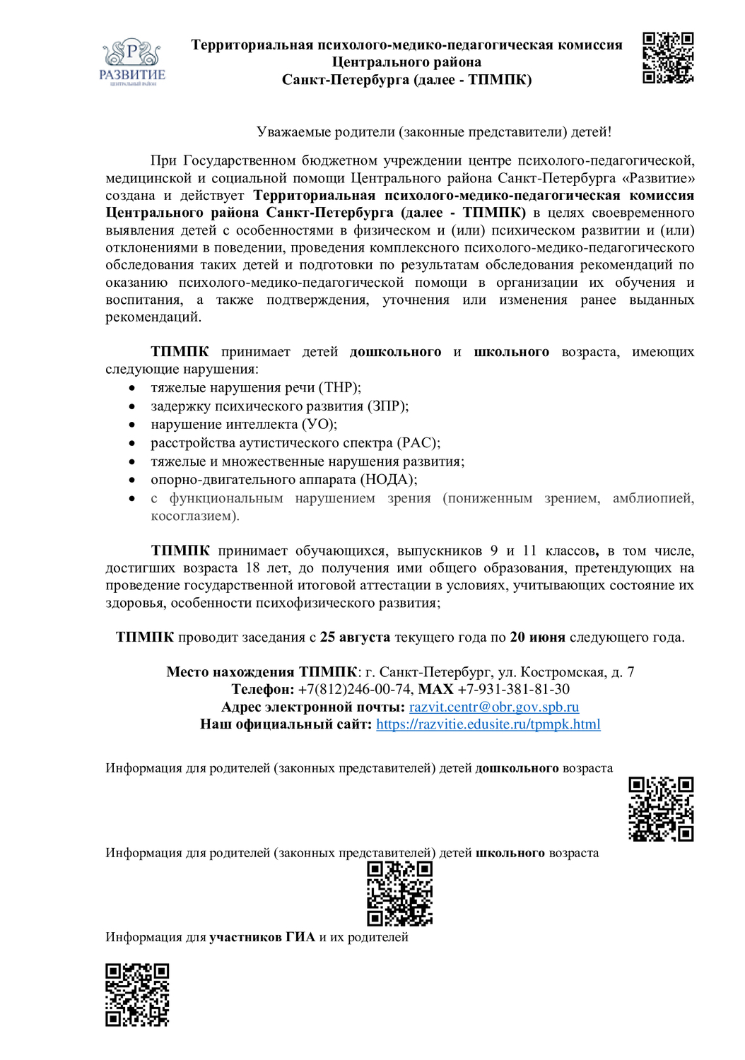 Вопросы по порядку комплектования можно задать по электронной почте: ronodou@center-edu.spb.ru или задать по телефону «Горячей линии» Комиссии по комплектованию +7 994 419 22 71