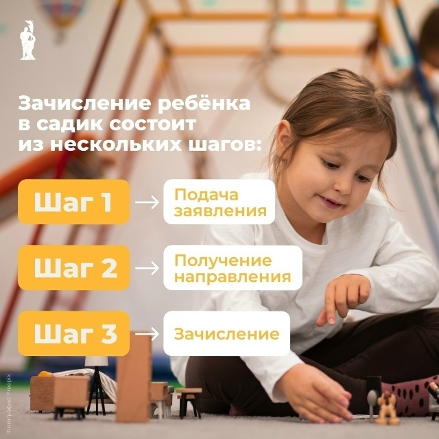 - «Процедура зачисления» ― перечень необходимых шагов для зачисления в выбранный сад: подача заявления, постановка на учёт, получение направления в ДДУ и зачисление.
